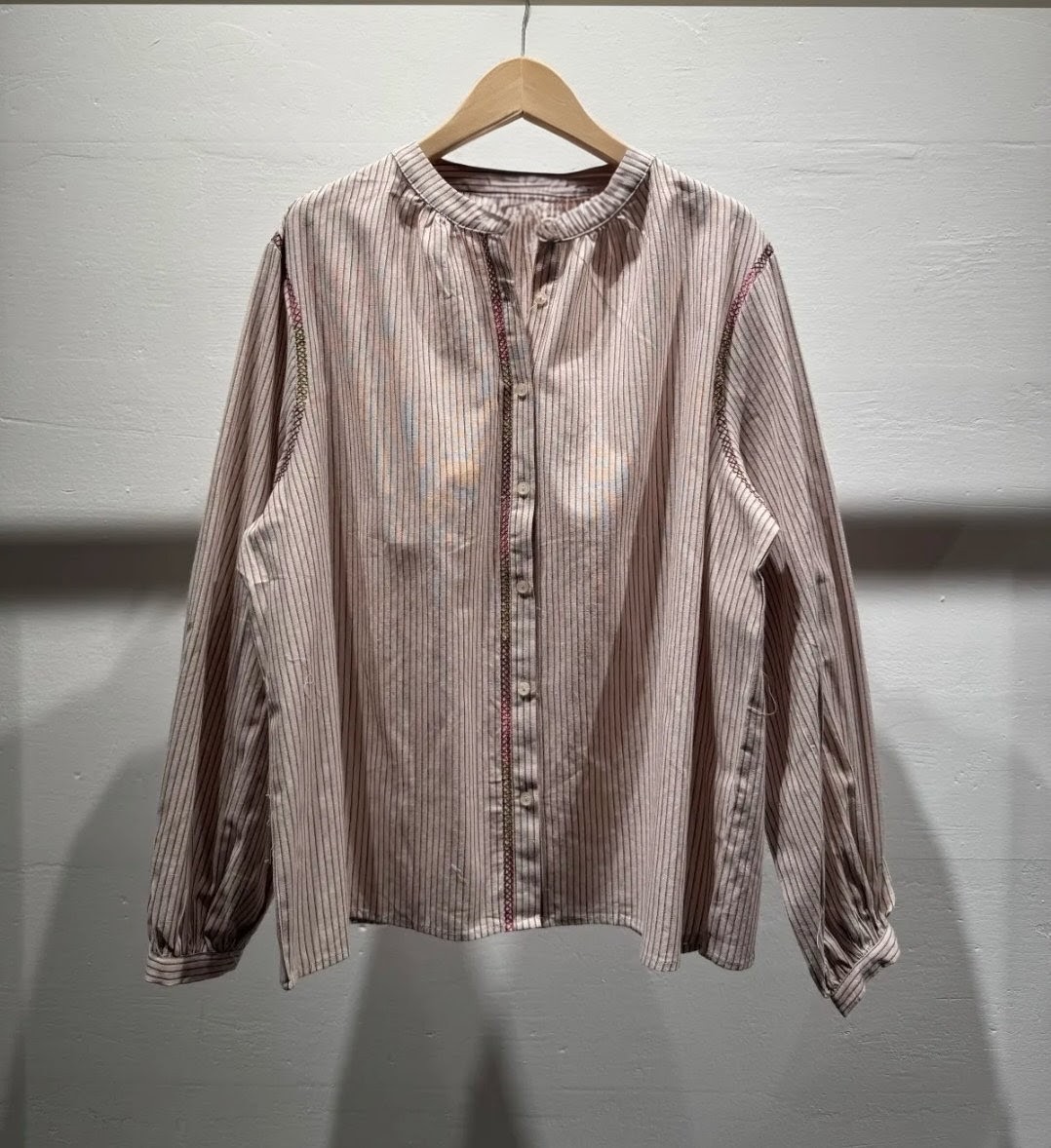 • Fines rayures et broderies patte de boutonnage et bord des manches
