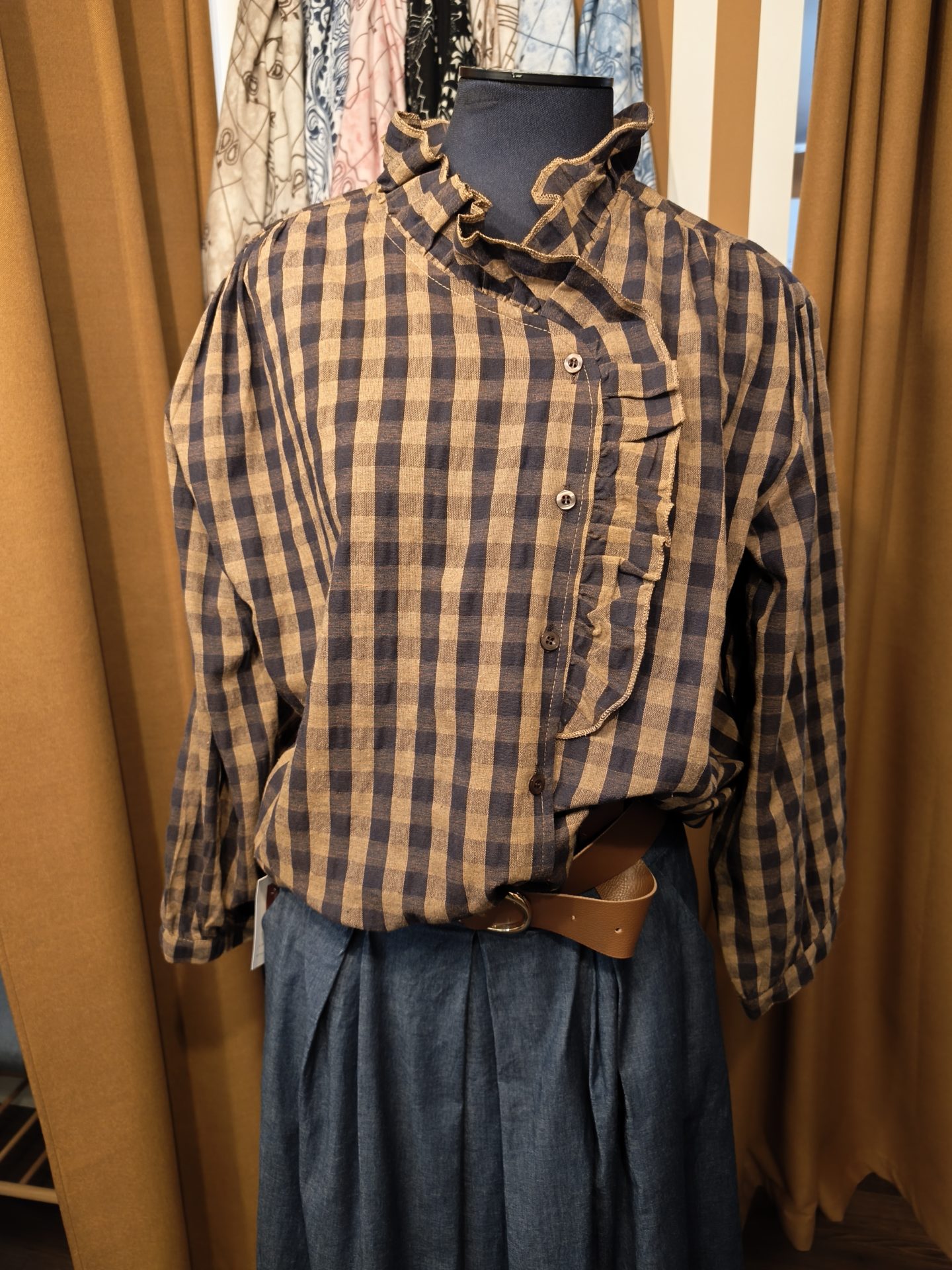Sa matière, ses carreaux et le col volanté apporte une touche féminine et élégante .