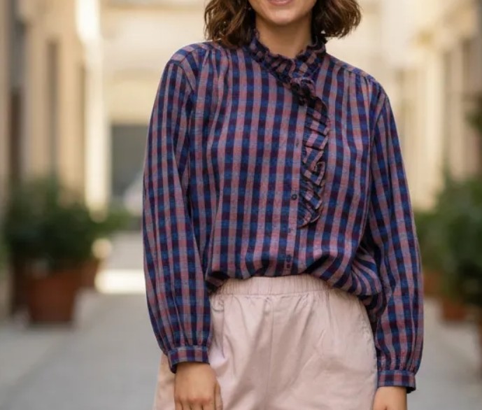 Sa matière, ses carreaux et le col volanté apporte une touche féminine et élégante .