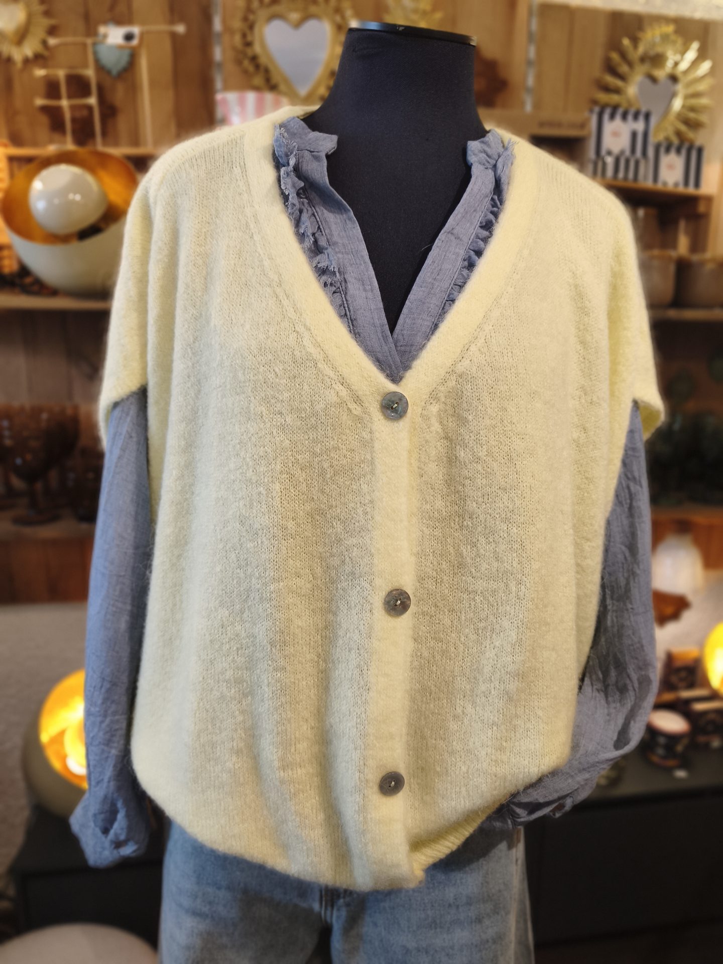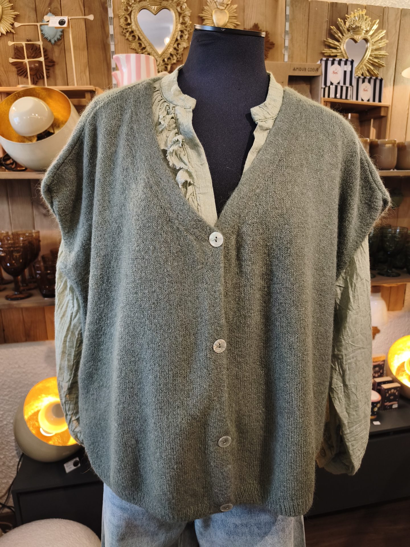 Optez pour l’élégance intemporelle avec notre cardigan sans manche . Ce cardigan polyvalent est un ajout parfait à votre garde-robe, que ce soit pour une journée décontractée ou une soirée élégante.Cardigan sans manches
