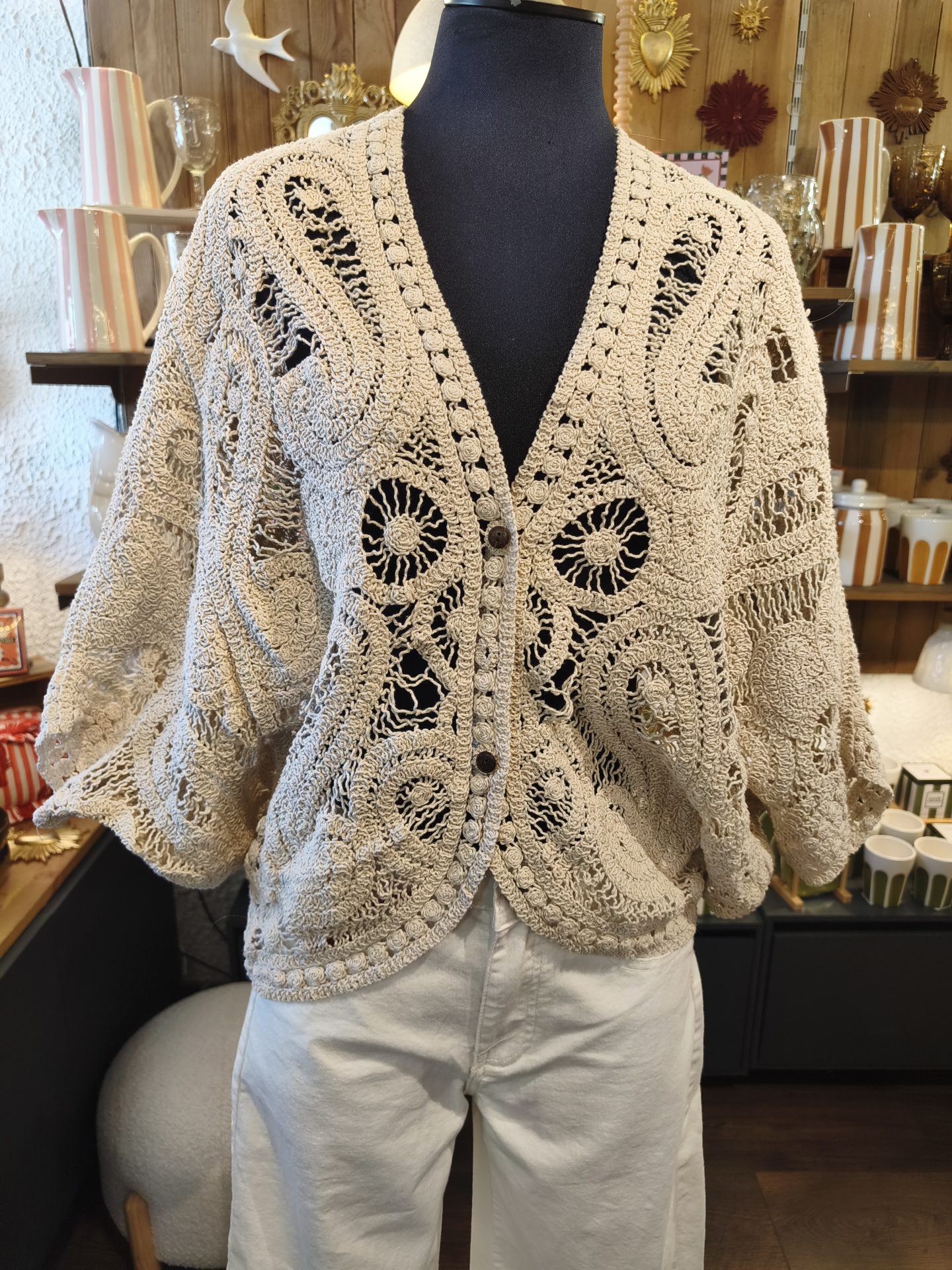 Gilet en crochet à la coupe loose, doté de manches 3/4 chauve-souris pour un look décontracté.