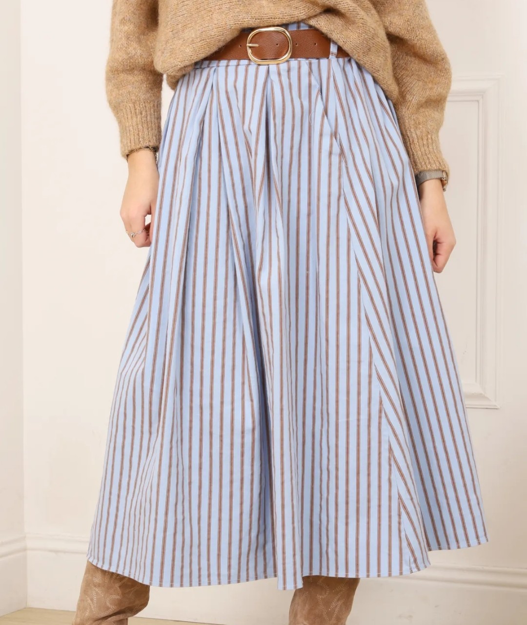 Cette jupe longue signée Johanna Paris est la pièce parfaite pour structurer votre silhouette avec sophistication. Sa confection dans un coton épais de haute qualité lui confère une tenue impeccable et un tombé lourd très élégant. Les plis plats à la taille créent un volume généreux qui danse à chacun de vos pas, tandis que ses rayures verticales allongent visuellement la ligne pour une allure élancée.