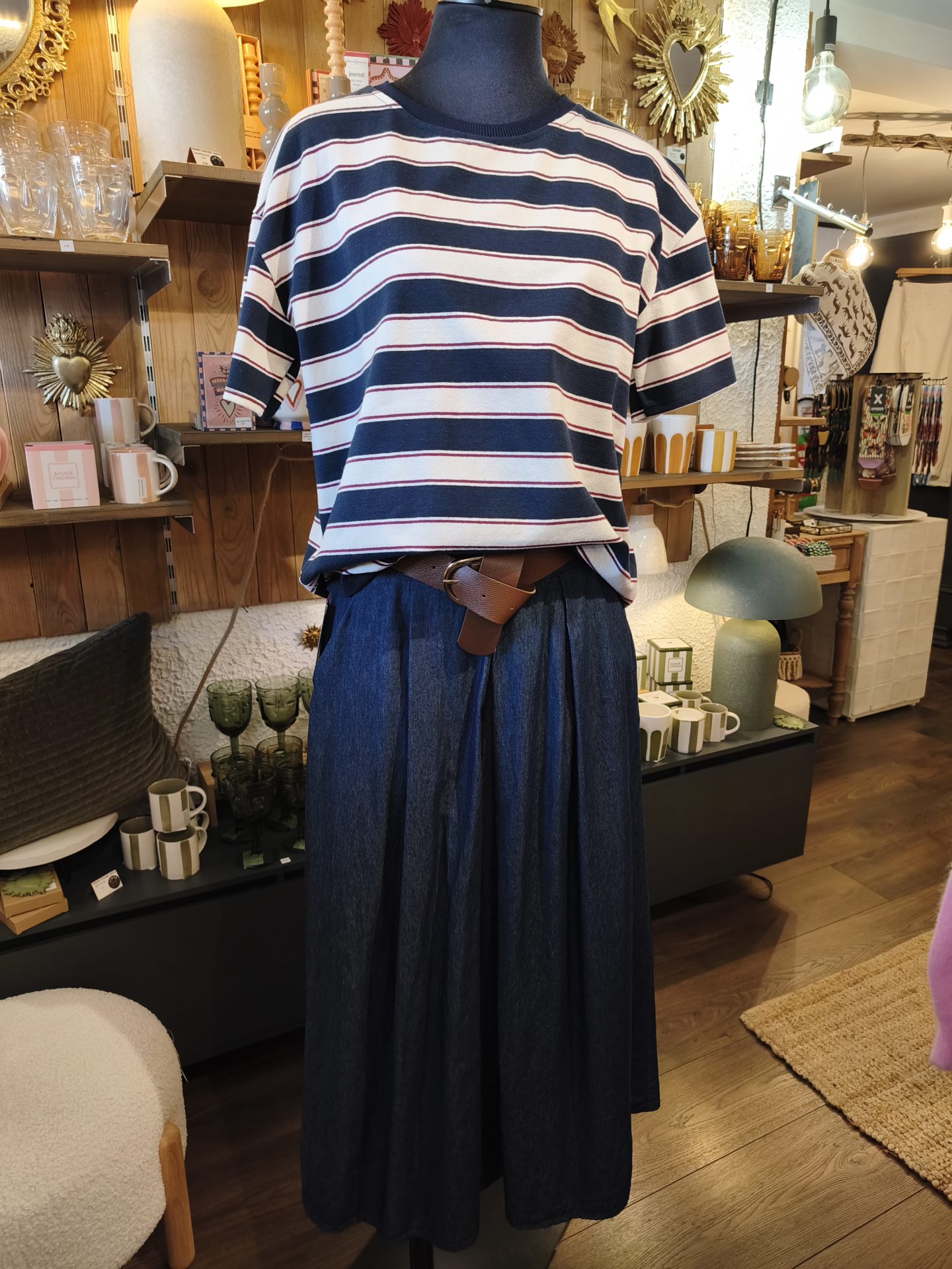 Jupe jean foncé, en coton léger. Taille haute, coupe fluide et légèrement évasée qui accompagne le mouvement. Se porte aussi bien avec un tee shirt qu’une chemise rentrée pour une allure féminine et facile au quotidien.