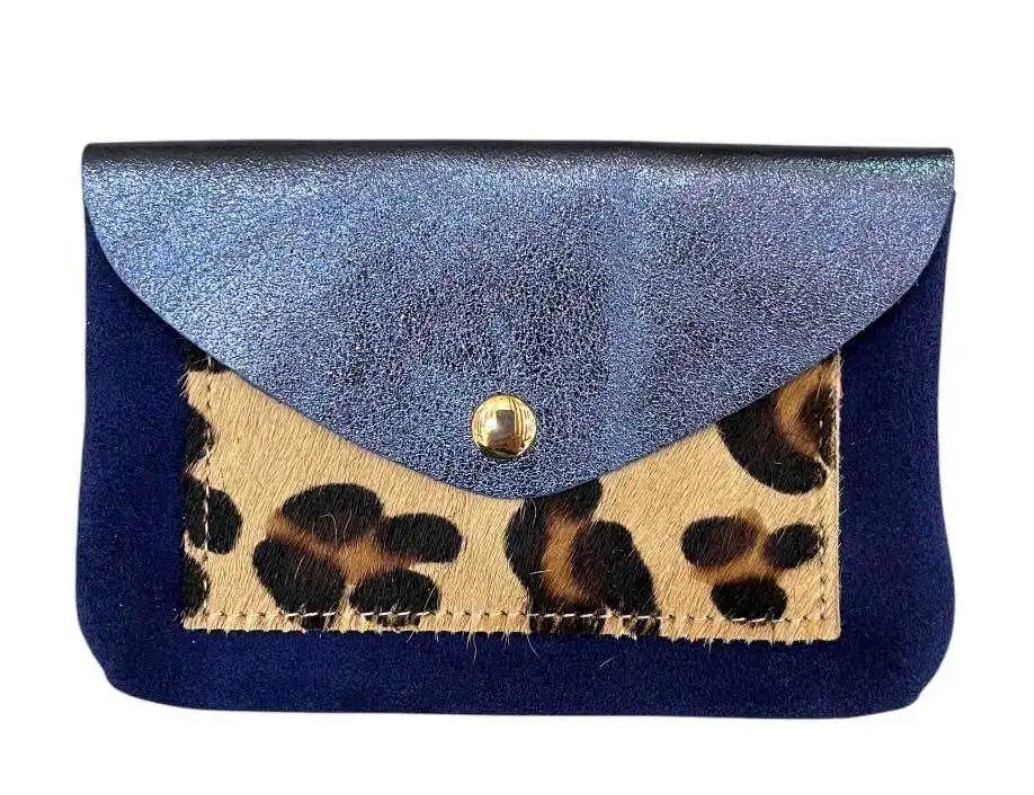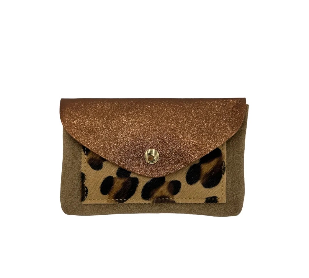 Portefeuille en cuir comprenant une grande  poche et une petite léopard.