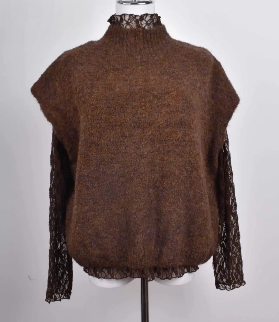 Ce pull col montant à manches courtes cache un véritable atout : un délicat top en dentelle bleu marine ou choco, dissocié qui se glisse dessous pour un effet superposé irrésistible.