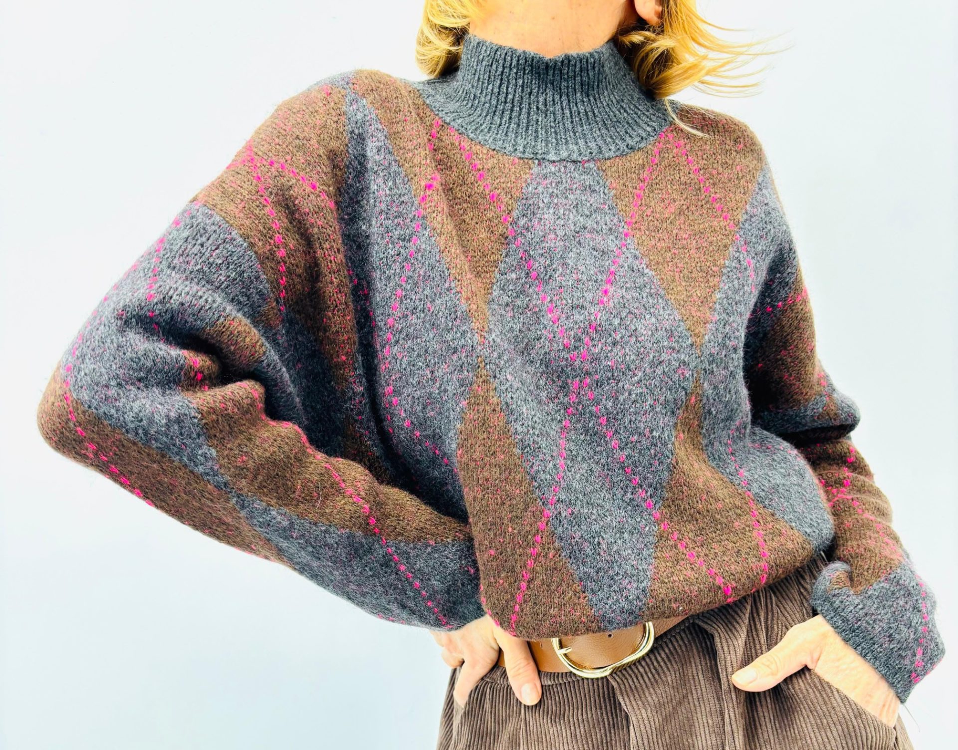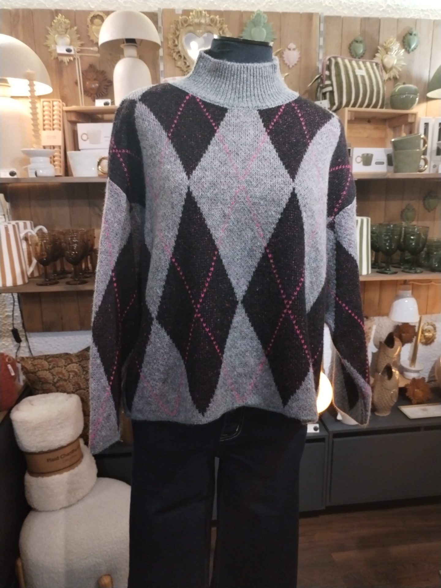Un pull doux à lallure graphique. Ses losanges audacieux et sa coupe droite en font une pièce forte, parfaite pour illuminer l’hiver.